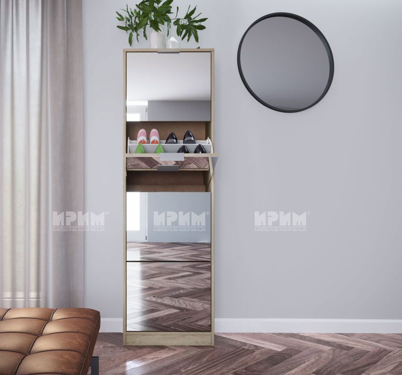 Шкаф за обувки Сити 4057 с четири падащи врати с огледала и механизъм за два реда обувки. Изработен е от ПДЧ с дебелина 16мм в цвят сонома арвен. Размер: 50/25/163,5 см.