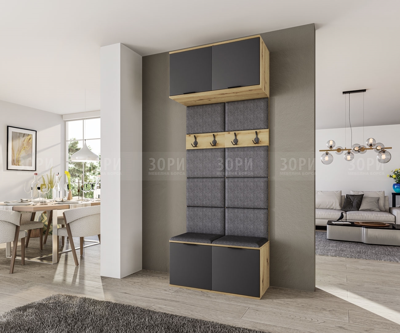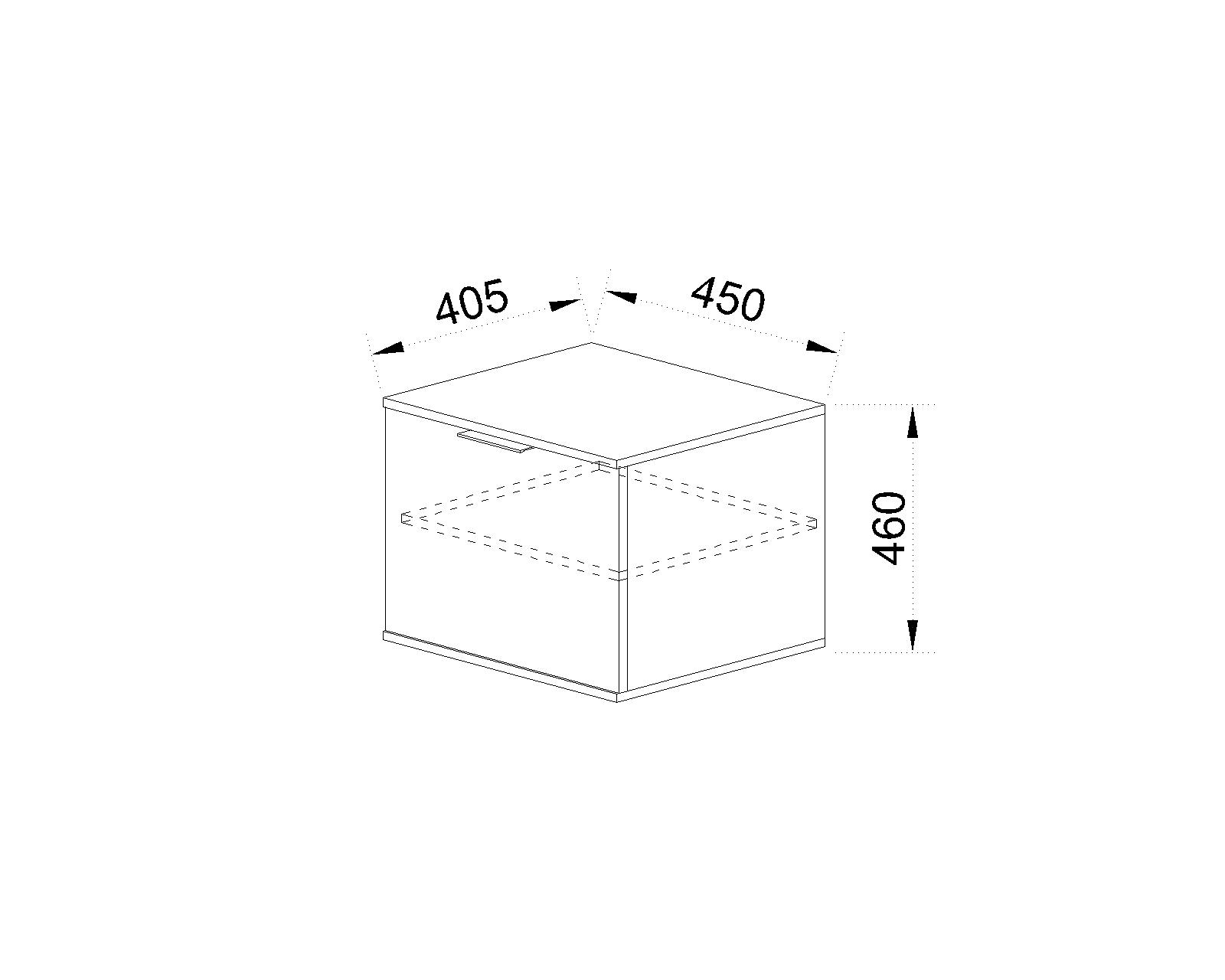 Шкаф с една врата и един рафт. Изработен от ПДЧ с дебелина 16 мм в цвят дъб артисан и графит. Има възможност за допълване с други модули. Размер: 45/40,5/46 см.