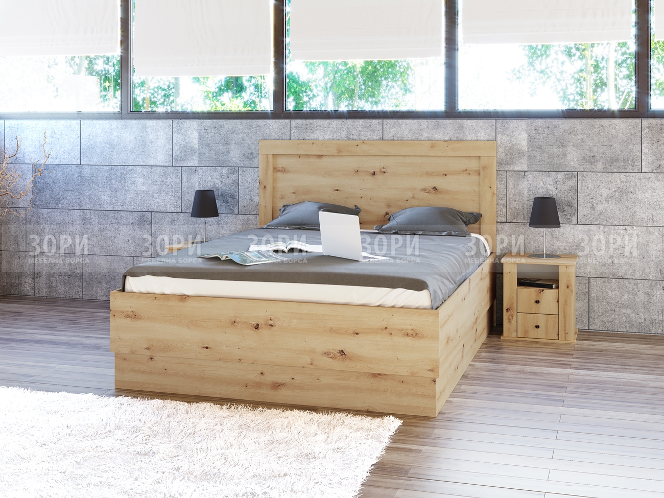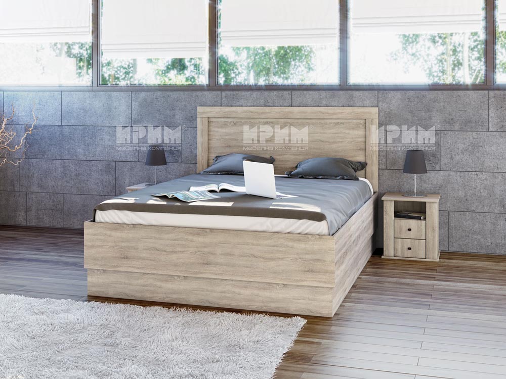 Висока спалня с две нощни шкафчета за матрак с размер 160/200, с повдигащи амортисьори. Изработено от ПДЧ 16мм в цвят сонома арвен и бяло гланц хайглос. Има възможност за поставяне на ламелна рамка и двулицев матрак. Височина на луба на леглото – 49 см. Размер на леглото: 165/206/121 см. Размер на нощно шкафче: 44/39.5/49 см.
