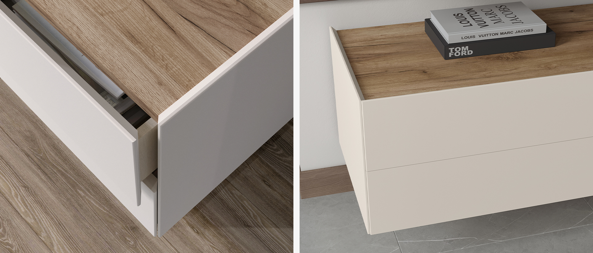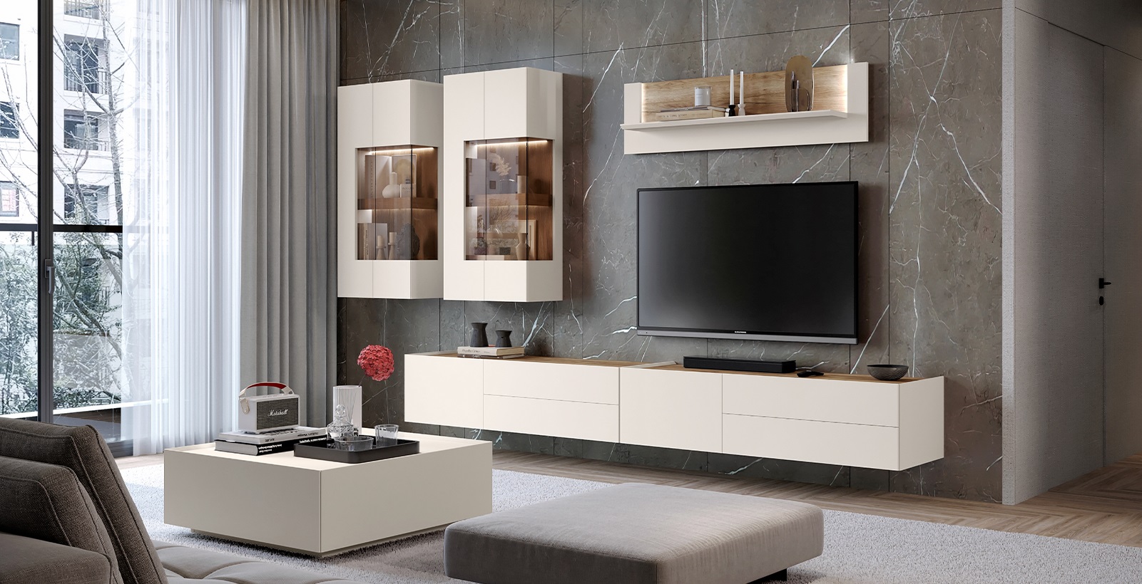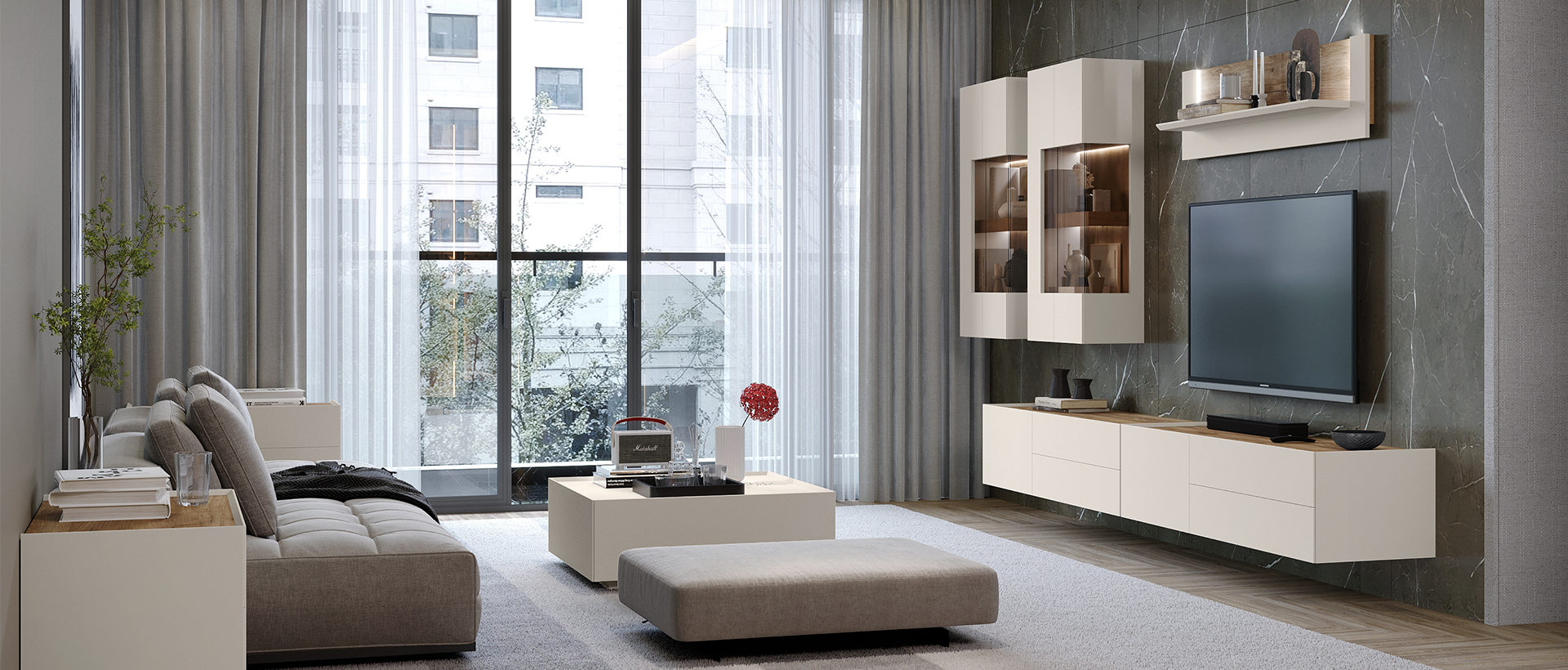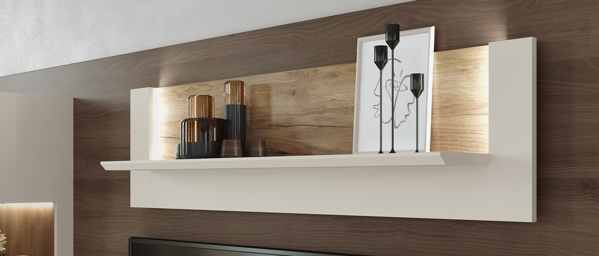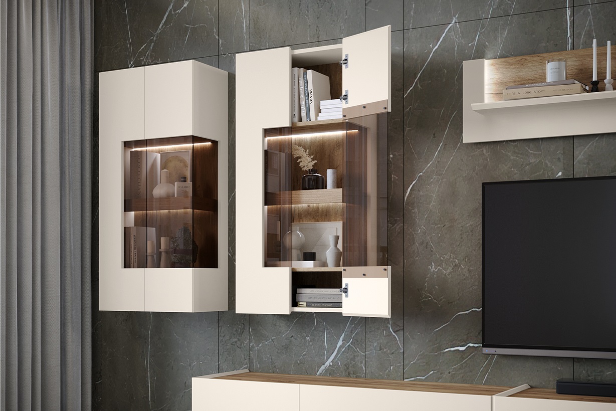 Секция за дневна SKY 45 с дизайнерско решение за съединяване на страници и чела под ъгъл 45 градуса, витрини и полица със скрито LED осветление. Страниците и челата са от МДФ, двустранно лакиран с UV лак с мек матов ефект в цвят кашмир в комбинация с дървесен декор дъб табак във вътрешната част. Плавно затваряне на врати и чекмеджета имат по-голяма устойчивост на износване и осигуряват максимална дълготрайност при ежедневна употреба.