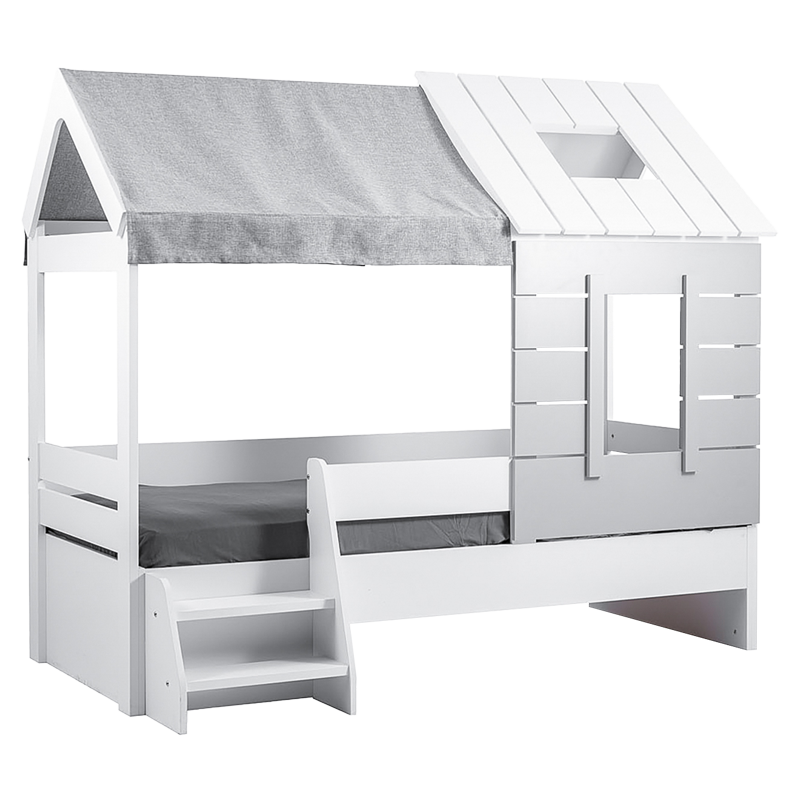 Детско легло White house е идеално място за мечти и приключения на вашето дете. С очарователен дизайн, наподобяващ горска къщичка, просторна зона за спане, с две стъпала за лесен достъп. Издръжлива конструкция от 18 мм ПДЧ гарантира дълготрайна употреба. Дизайнът на леглото е съобразен с Монтесори принципите за насърчаване на самостоятелността на детето и стимулиране на въображението му и ролевите игри. Леглото има подматрачна рамка, а размерите му са съобразени за матрак 90/200.