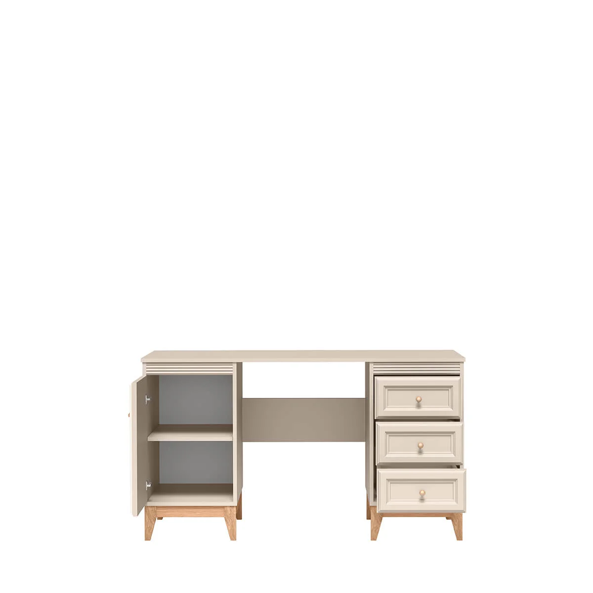 Windsor елегантно съчетава класически дизайн с модерна функционалност. Бюро с една врата и три чекмеджета с плавно затваряне. Изработено от ПДЧ с дебелина 16мм и 22мм, лицева част от МДФ и крака от масив. Топло съчетание на цветове кашмир и дъб евок. Размер: 138/54,5/78 см.