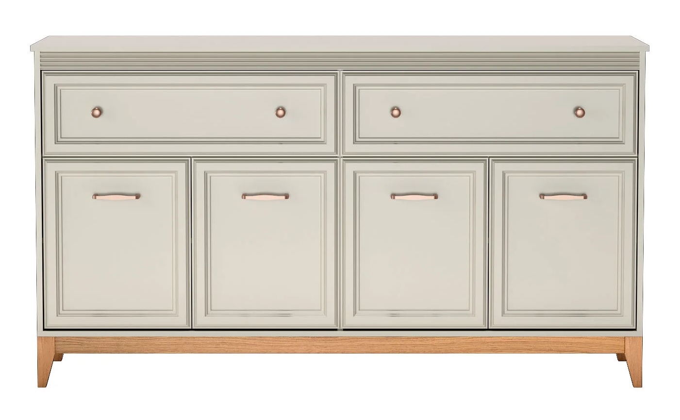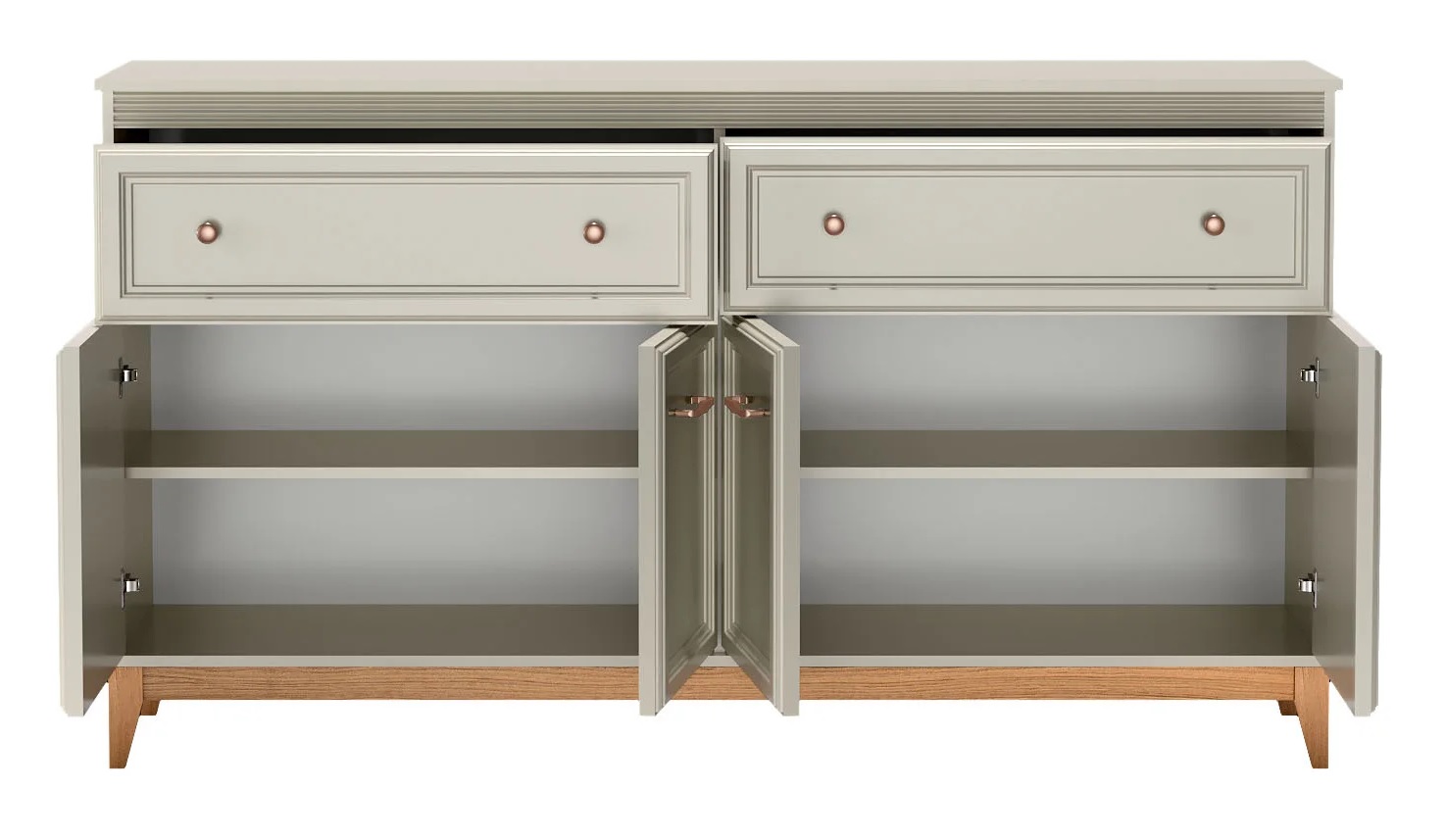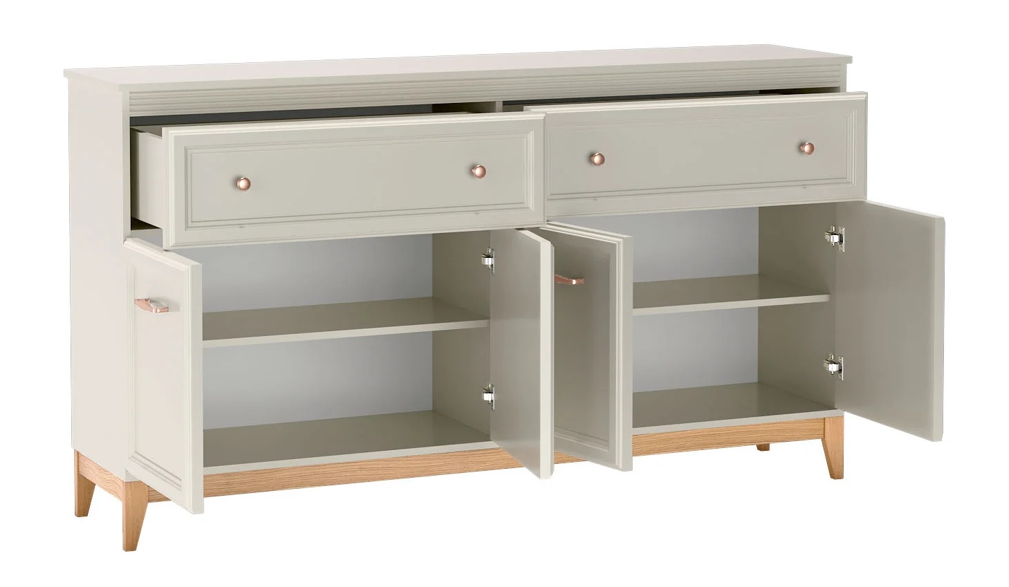 Windsor елегантно съчетава класически дизайн с модерна функционалност. Скрин за дневна с две чекмеджета и четири врати с плавно затваряне. Изработен от ПДЧ с дебелина 16мм и 22мм, лицева част от МДФ и крака от масив. Топло съчетание на цветове кашмир и дъб евок. Размер: 179/40,5/100 см.