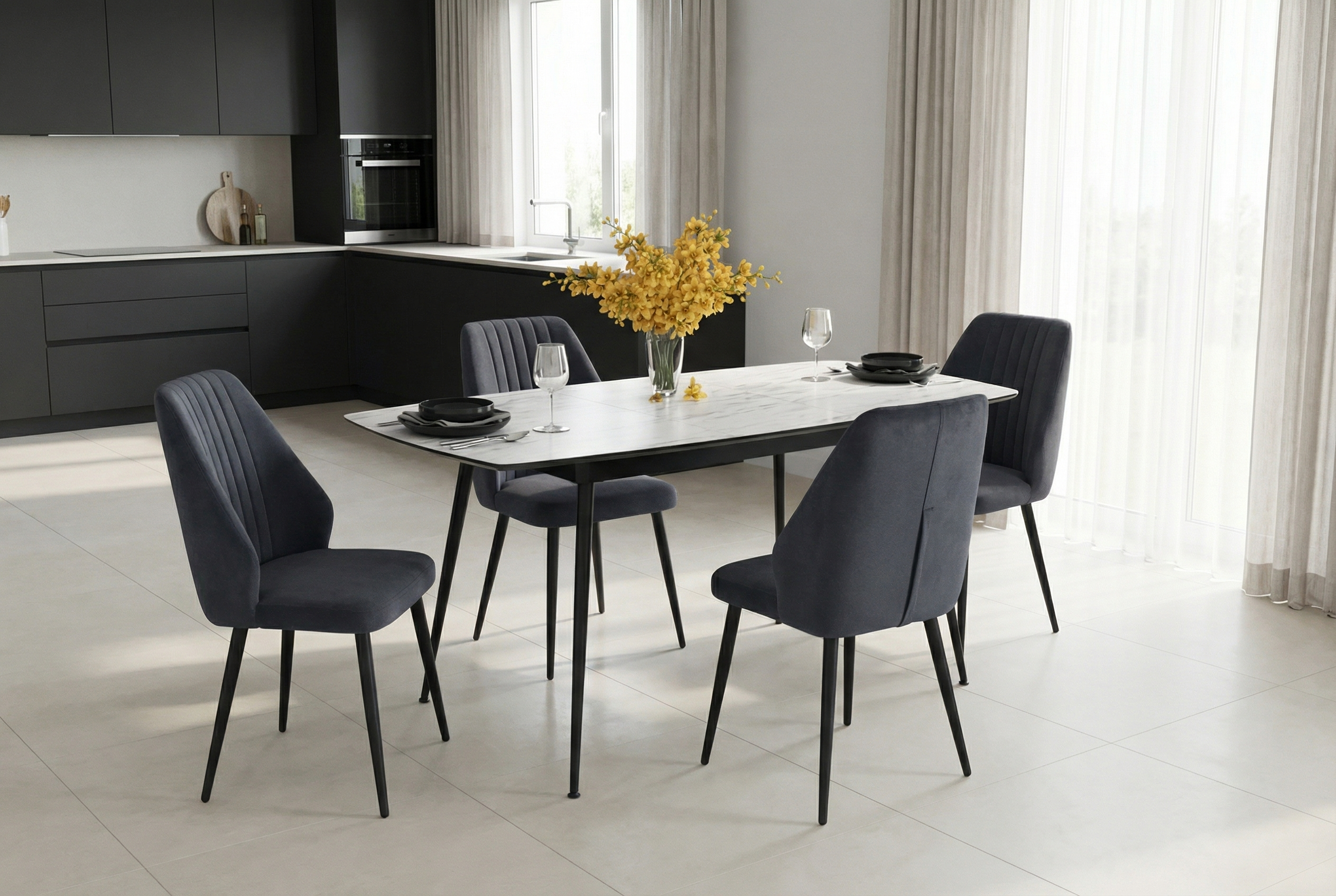 Tрапезна маса с разтегателен механизъм. Плотът е изработен от МДФ в цвят бял мрамор, краката от праховобоядисан метал в черен цвят. Размер: 125-165/80/76 см.